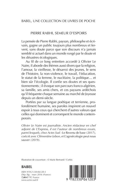 Ce long entretien est l'occasion pour Pierre Rabhi, agriculteur, écrivain et penseur, de s'adresser aux autres, mais aussi à lui- même, comme il ne l'avait jamais fait jusqu'à présent. Et d'approfondir sa réflexion tout en restant, selon son habitude, concret, humain, terrien. Et plus que jamais philosophe et poète.