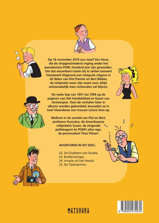 Op 16 november 2019 zou Jozef Van Hove, die de stripgeschiedenis inging onder het pseudoniem POM, honderd jaar zijn geworden. Om dat eeuwfeest luister bij te zetten lanceerde Standaard Uitgeverij een integrale uitgave in elf delen van Piet Pienter en Bert Bibber, de stripreeks waar zijn naam voor altijd onlosmakelijk mee verbonden zal blijven. De reeks liep van 1951 tot 1995 op de pagina’s van Het Handelsblad en Gazet van Antwerpen. Toen de verhalen later in albums werden gebundeld, bouwden ze in heel Vlaanderen een trouwe schare fans op. Welkom in de wereld van Piet en Bert, professor Kumulus, de Amerikaanse miljardaire Susan, de zingende politieagent én POM’s alter ego, de persmuskiet Theo Flitser! Deze intergrale bevat volgende avonturen: De diadeem van Swaba (22), Bulderlachgas (23), Invasie uit het heelal (24), De tijdmachine (25).