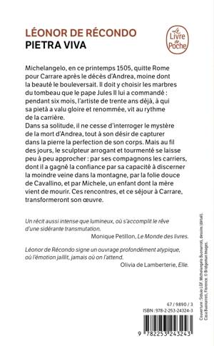 Dans sa solitude, il ne cesse d’interroger le mystère de la mort du moine, tout à son désir de capturer dans la pierre sa beauté terrestre. Mais au fil des jours, le sculpteur arrogant et tourmenté se laisse peu à peu approcher : par ses compagnons les carriers, dont il a gagné la confiance par sa capacité à discerner la moindre veine dans la montagne, par la folie douce de Cavallino, et par Michele, un enfant dont la mère vient de mourir. Ces rencontres, et ce séjour à Carrare, transformeront profondément son œuvre.