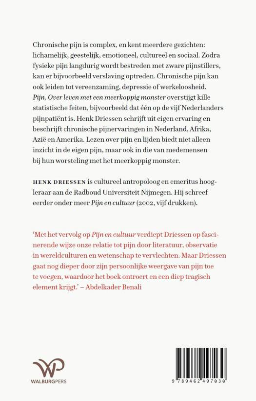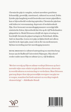'Pijn. Over leven met een meerkoppig monster' overstijgt kille statistische feiten, bijvoorbeeld dat één op de vijf Nederlanders pijnpatiënt is. Henk Driessen schrijft uit eigen ervaring en beschrijft enkele chronische pijnervaringen in Nederland, Afrika, Azië en Amerika. Lezen over pijn en lijden biedt niet alleen inzicht in de eigen pijn, maar ook in die van medemensen bij hun worsteling met het meerkoppig monster.