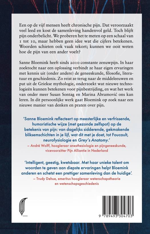 Sanne Bloemink heeft sinds 2010 constante zenuwpijn. In haar zoektocht naar een oplossing verbindt ze haar eigen ervaringen met kennis uit (onder andere) de geneeskunde, filosofie, literatuur en geschiedenis. Zo reist ze terug naar de middeleeuwen en put uit de Griekse mythologie, onderzoekt wat nieuwe technologieën kunnen betekenen voor pijnbestrijding, en wat het werk van onder meer Susan Sontag en Marina Abramović ons kan leren. In dit persoonlijke werk gaat Bloemink op zoek naar een nieuwe manier van denken en praten over pijn.