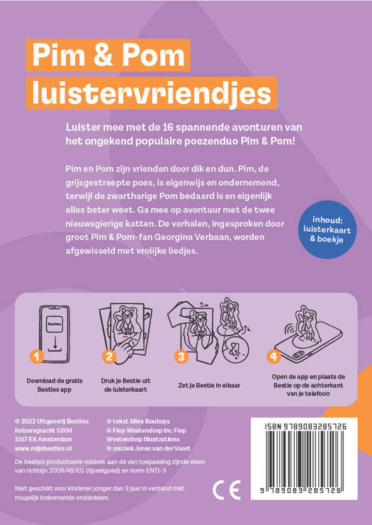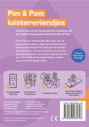 Pim en Pom zijn vrienden door dik en dun. Pim, de grijsgestreepte poes, is eigenwijs en ondernemend, terwijl de zwartharige Pom bedaard is en eigenlijk alles beter weet. Ga mee op avontuur met de twee nieuwsgierige katten.