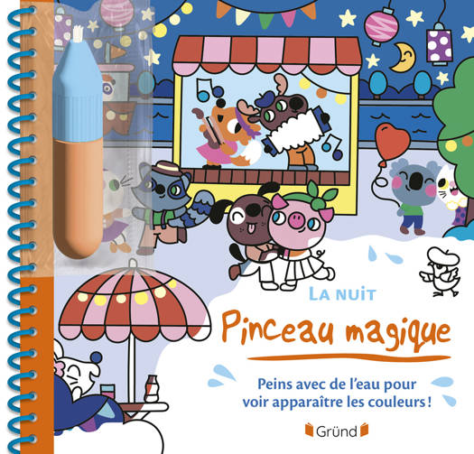 C'est magique ! Il suffit de remplir son pinceau avec de l'eau, puis de le passer sur les 6 décors du carnet pour voir apparaître de belles scènes de nuit : des enfants qui improvisent une tente de couvertures, un feu de camp dans la forêt, la guinguette de l'été, une mystérieuse ombre dans la maison, une maison vue de l'extérieur, une soirée de fête de la Saint-Jean... Attends un peu : les décors disparaissent quand les pages sèchent pour que tu puisses recommencer à l'infini !