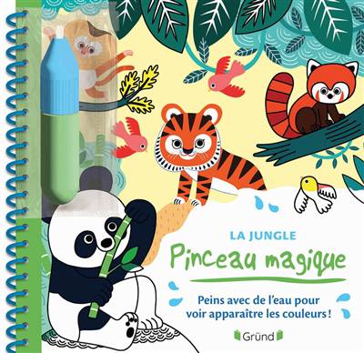 C'est magique ! Il suffit de remplir son pinceau avec de l'eau, puis de le passer sur les 6 décors du carnet pour voir apparaître des scènes et animaux de la jungle : des singes dans les lianes, un petit lézard dans les ruines, un bébé jaguar au lever du jour, un panda dans la forêt de bambou... Attends un peu : les décors disparaissent quand les pages sèchent pour pouvoir recommencer à l'infini !