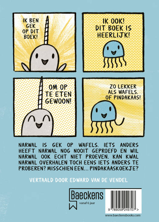 Narwal is gek op wafels. Iets anders heeft Narwal nog nooit geproefd en wil Narwal ook helemaal niet proeven. Kan Kwal Narwal overhalen toch eens iets anders te proberen? Misschien een… pindakaaskoekje?