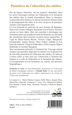 Ce livre présente les portraits de onze femmes de Belgique, États-Unis, France, Pologne, Royaume-Uni et Suisse. Par leurs actions ou leurs idées, elles ont contribué à développer des formations dans une grande diversité de domaines ou ont fondé des institutions dont certaines existent encore aujourd'hui. Il s'agit de Marie-Jeanne Bassot, Victoire Cappe, Marguerite Champendal, Jeanne Deroin, Mary Follett, Isabelle et Zoé Gatti de Gamond, Virginia Gildersleeve, Élise Luquin, Helena Radlinska et Caroline Spurgeon. Sans aucunement prétendre à l'exhaustivité, l'ouvrage entend marquer une première étape dans le chemin vers la découverte de nouvelles pionnières de l'éducation des adultes.