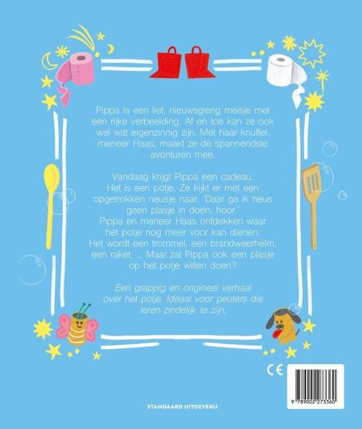 Pippa heeft een rijke verbeelding en is daarnaast ook een tikkeltje eigenzinnig. Plassen op dat potje? Nee, dank u! In Pippa op het potje ontdekt ze met haar knuffel, meneer Haas, waar het potje nog allemaal voor kan dienen. Het wordt een raket, een trommel, een brandweerhelm… en nog zoveel meer, want aan verbeelding zijn geen grenzen.