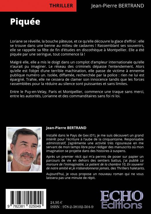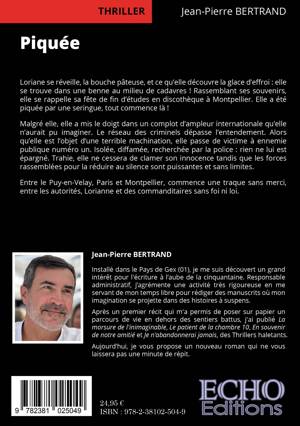 Loriane se réveille, la bouche pâteuse, et ce qu'elle découvre la glace d'effroi : elle se trouve dans une benne au milieu de cadavres ! Rassemblant ses souvenirs, elle se rappelle sa fête de fin d'études en discothèque à Montpellier. Elle a été piquée par une seringue, tout commence là ! Malgré elle, elle a mis le doigt dans un complot d'ampleur internationale qu'elle n'aurait pu imaginer. Le réseau des criminels dépasse l'entendement. Alors qu'elle est l'objet d'une terrible machination, elle passe de victime à ennemie publique numéro un. Isolée, diffamée, recherchée par la police : rien ne lui est épargné. Trahie, elle ne cessera de clamer son innocence tandis que les forces rassemblées pour la réduire au silence sont puissantes et sans limites. Entre le Puy-en-Velay, Paris et Montpellier, commence une traque sans merci, entre les autorités, Lorianne et des commanditaires sans foi ni loi.