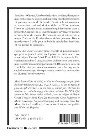 Piscine (pas d'eau) est une pièce chorale et polyphonique, qui peut se jouer à un(e) ou à plusieurs. Avec une verve autocritique, l'artiste Mark Ravenhill fait le procès de l'art contemporain face à un capitalisme qu'il est censé combattre, mais dont il s’accommode parfaitement. Il brosse une satire au vitriol d'artistes qui prétendent œuvrer contre les dogmes du libéralisme sauvage, alors que leurs actes envieux et mesquins en illustrent les pires travers.