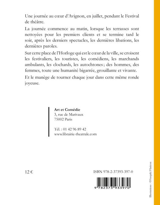 Une journée au coeur d'Avignon, en juillet, pendant le Festival de théâtre. La journée commence au matin, lorsque les terrasses sont nettoyées pour les premiers clients et se termine tard le soir, après les derniers spectacles, les dernières libations, les dernières paroles. Sur cette place de l'Horloge qui est le coeur de la ville, se croisent les festivaliers, les touristes, les comédiens, les marchands ambulants, les clochards, les autochtones ; des hommes, des femmes, toute une humanité bigarrée, grouillante et vivante.Et le manège de tourner chaque jour dans cette même ronde joyeuse.