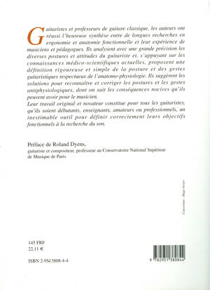 Guitaristes et professeurs de guitare classique, les auteurs analysent avec une grande précision les diverses postures et attitudes du guitariste et proposent une définition rigoureuse et simple de la posture et des gestes guitaristiques respectueux de l’anatomo-physiologie. Ils suggèrent les solutions pour reconnaître et corriger les postures et les gestes antiphysiologiques, dont on sait les conséquences nocives qu’ils peuvent avoir pour le musicien. Leur travail original et novateur constitue pour tous les guitaristes, qu’ils soient débutants, enseignants, amateurs ou professionnels, un inestimable outil pour définir correctement leurs objectifs fonctionnels à la recherche du son.