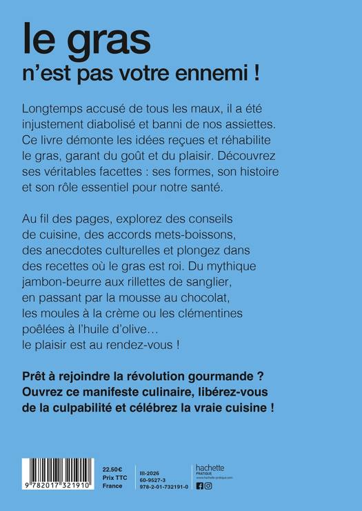 Longtemps accusé de tous les maux, il a été injustement diabolisé et banni de nos assiettes. Ce livre démonte les idées reçues et réhabilite le gras, garant du goût et du plaisir. Découvrez ses véritables facettes : ses formes, son histoire et son rôle essentiel pour notre santé. Au fil des pages, explorez des conseils de cuisine, des accords mets-boissons, des anecdotes culturelles et plongez dans des recettes où le gras est roi. Du mythique jambon-beurre aux rillettes de sanglier, en passant par la mousse au chocolat, les moules à la crème ou les clémentines poêlées à l’huile d’olive… le plaisir est au rendez-vous ! Prêt à rejoindre la révolution gourmande ? Ouvrez ce manifeste culinaire, libérez-vous de la culpabilité et célébrez la vraie cuisine !