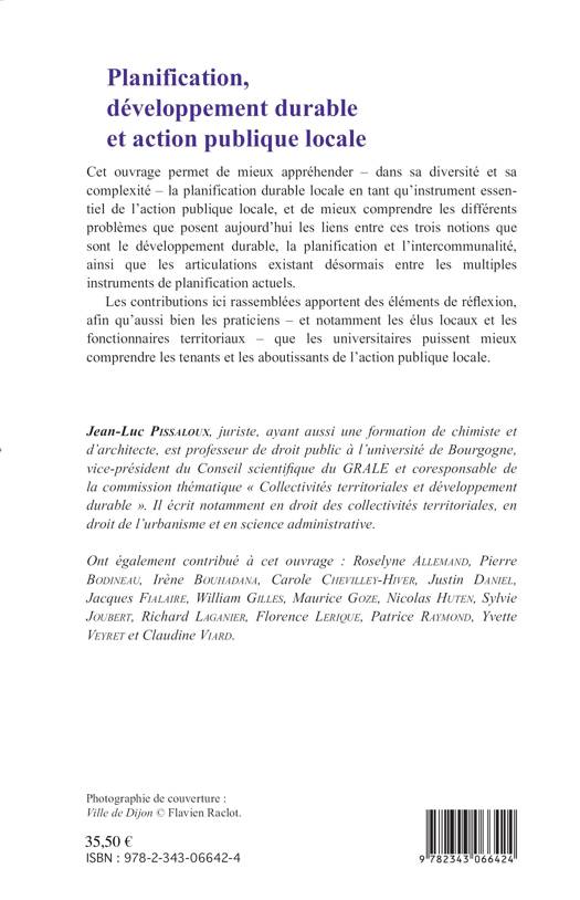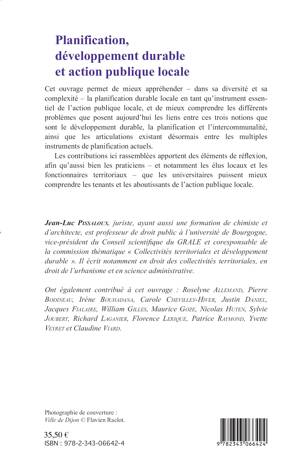 Cet ouvrage permet de mieux appréhender - dans sa diversité et sa complexité - la planification durable locale en tant qu'instrument essentiel de l'action publique locale, et de mieux comprendre les différents problèmes que posent aujourd'hui les liens entre les trois notions que sont le développement durable, la planification et l'intercommunalité, ainsi que les articulations existant désormais entre les multiples instruments de planification actuels.