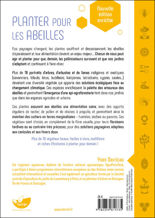 Nos paysages changent, les plantes souffrent et dessaisonnent, les abeilles disparaissent et leur alimentation devient un enjeu majeur… Chacun de nous peut agir et planter pour que, demain, les pollinisateurs survivent et que nos jardins s’adaptent et continuent à faire rêver. Plus de 70 portraits d’arbres, d’arbustes et de lianes indigènes et exotiques (savonniers, tilleuls, lotus, buddleias, kalopanax, tetradiums, cyprès, saules…) dévoilent une diversité végétale qui apporte des solutions écologiques face au changement climatique. Ces espèces enrichissent la palette des amoureux des abeilles et permettent l’émergence d’une api-agroforesterie tant dans nos jardins que dans les espaces agricoles et urbains. Ces plantes assurent aux abeilles une alimentation saine, avec des apports réguliers de nectar, de pollen et de résines à propolis, et permettent ainsi le maintien des ruchers en terres marginalisées – humides, sèches ou pauvres. Ces végétaux sont choisis, en complément de la flore usuelle, pour leurs floraisons tardives ou au contraire très précoces, pour des solutions paysagères adaptées aux canicules et aux hivers doux.