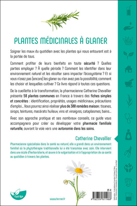Soigner les maux du quotidien avec les plantes qui nous entourent est à la portée de tous. Comment profiter de leurs bienfaits en toute sécurité ? Quelles parties employer ? À quelle période ? Comment les identifier dans leur environnement naturel et les récolter sans impacter l’écosystème ? Et si vous n’osez pas (encore) les glaner ou n’en avez pas la possibilité, comment les choisir et lesquelles les cultiver ? Ce livre répond à toutes ces questions. De la cueillette à la transformation, la pharmacienne Catherine Chevallier présente 58 plantes communes en France à travers des fiches simples et concrètes : identification, propriétés, usages médicinaux, précautions d’emploi… Vous pourrez ainsi réaliser plus de 300 remèdes maison : tisanes, sirops, teintures, macérats huileux, vins et vinaigres, cataplasmes, bains… Avec son approche pratique et ses nombreux conseils, ce guide vous accompagnera pour créer ou développer votre pharmacie familiale naturelle, ouvrant la voie vers une autonomie dans les soins.