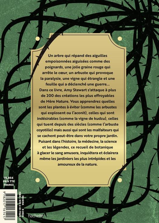 Un arbre qui répand des aiguilles empoisonnées aiguisées comme des poignards, une jolie graine rouge qui arrête le cœur, un arbuste qui provoque la paralysie, une vigne qui étrangle et une feuille qui a déclenché une guerre... Dans ce livre, Amy Stewart s'attaque à plus de 200 des créations les plus effroyables de Mère Nature. Vous apprendrez quelles sont les plantes à éviter (comme les arbustes qui explosent ou l’aconit), celles qui sont indésirables (comme la vigne de kudzu), celles qui tuent depuis des siècles (comme l'arbuste coyotillo) mais aussi qui sont les malfaiteurs qui se cachent peut-être dans votre propre jardin. Puisant dans l'histoire, la médecine, la science et les légendes, ce recueil de botanique à glacer le sang amusera, inquiétera et éclairera même les jardiniers les plus intrépides et les amoureux de la nature.