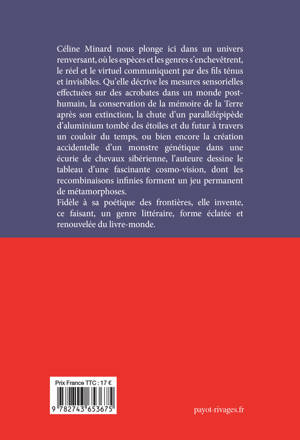 Céline Minard nous plonge dans un univers renversant, où les espèces et les genres s'enchevêtrent, le réel et le virtuel communiquent par des fils ténus et invisibles. Qu'elle décrive les mesures sensorielles effectuées sur des acrobates dans un monde post-humain, la conservation de la mémoire de la Terre après son extinction, la chute d'un parallélépipède d'aluminium tombé des étoiles et du futur à travers un couloir du temps, ou bien encore la création accidentelle d'un monstre génétique dans une écurie de chevaux sibérienne, l'auteure dessine le tableau d'une fascinante cosmo-vision, dont les recombinaisons infinies forment un jeu permanent de métamorphoses. Fidèle à sa poétique des frontières, elle invente, ce faisant, un genre littéraire, forme éclatée et renouvelée du livre-monde.