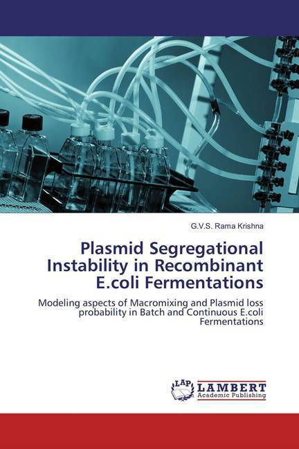 Segregational instability of plasmids in genetically altered Escherichia coli bacteria is not suitable for successful production of recombinant products. In this study, Escherichia coli C600 galK containing the plasmid pBR Eco gap, which codes for glyceraldehyde-3-phosphate dehydrogenase (GAPDH), was studied under industrial conditions for GAPDH production. Detailed mathematical models were developed for batch and continuous fermentations by introducing non-ideality through imperfect mixing, variable plasmid loss probability, and simulated for both fermenters by regulating mixing intensities (as a function of dilution rates). Effect of finite macromixing and a variable plasmid loss probability on plasmid stability, substrate utilization and product formation were explored by inserting generalized plasmid replication kinetics into an experimentally validated macromixing model.