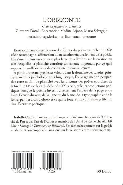 L'extraordinaire diversification des formes du poème au début du XXe siècle accompagne l'affirmation du nécessaire renouvellement de la poésie. Elle s'inscrit dans un contexte plus large de réflexions sur la création au sein desquelles la plasticité constitue un schème important par ce qu'il suppose de malléabilité et de contrainte interne à l'uvre. À partir d'une analyse de ses valeurs dans le domaine des savoirs, principalement la psychologie et la linguistique, l'ouvrage met en perspective cette notion de plasticité avec les discours des poètes et artistes de la fin du XIXe siècle et du début du XXe siècle, et leurs productions poétiques, lorsque le poème investit diversement l'espace de la page et du livre. L'étude du vers, de la ligne ou du blanc, de la typographie et de la lettre, permet alors d'observer ce qui se joue, entre contrainte et liberté, dans l'écriture poétique.