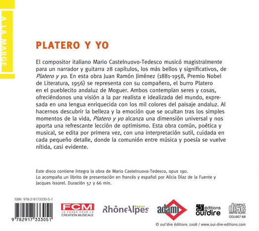 Le compositeur italien Mario Castelnuovo-Tedesco a magistralement mis en musique pour narrateur et guitare 28 chapitres, les plus beaux et significatifs, de Platero y yo , l'un des livres les plus lus en Espagne et en Amérique latine. Son auteur, Juan Ramón Jiménez (1881-1958, prix Nobel de Littérature en 1956) s'y met en scène avec son compagnon, l'âne Platero, dans son petit village andalou de Moguer. Tous deux regardent les êtres et les choses, nous offrant une vision du monde à la fois réaliste et idéalisée, exprimée dans une langue riche des mille couleurs du paysage andalou. En nous faisant découvrir la beauté et l'émotion qui se cachent derrière les plus simples instants de la vie, Platero y yo atteint une dimension universelle et nous apporte une rafraîchissante leçon d'optimisme. Clément Riot et Miguel Ángel Romero nous offrent une interprétation subtile qui rend la communion entre musique et poésie, nette, brillante, presque évidente.