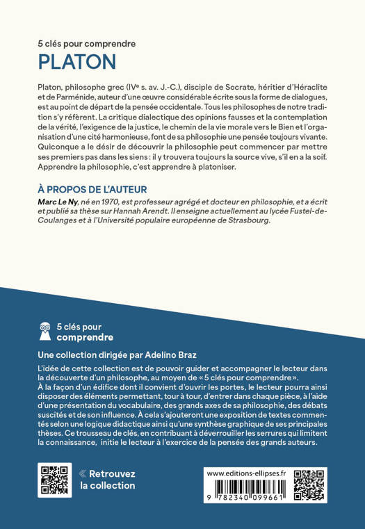 Platon, philosophe grec (IVe s. av. J.-C.), disciple de Socrate, héritier d’Héraclite et de Parménide, auteur d’une œuvre considérable écrite sous la forme de Dialogues, est au point de départ de la pensée occidentale. Tous les philosophes de notre tradition s’y réfèrent. La critique dialectique des opinions fausses et la contemplation de la vérité, l’exigence de la justice, le chemin de la vie morale vers le Bien et l’organisation d’une cité harmonieuse, font de sa philosophie une pensée toujours vivante. Quiconque a le désir de découvrir la philosophie peut commencer par mettre ses premiers pas dans les siens : il y trouvera toujours la source vive, s’il en a la soif. Apprendre la philosophie, c’est apprendre à platoniser.