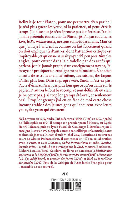 Relirais-je tout Platon, pour me permettre d'en parler ? Je n'ai plus guere les yeux, ni la patience, ni peut-etre le temps. J'ajoute que je n'en eprouve pas la necessite. Je n'ai jamais pretendu tout savoir de Platon, je n'ai pas tout lu, les Lois, le Parmenide aussi, me sont tombes des mains. Mais ce que j'ai lu je l'ai bien lu, comme on fait forcement quand on doit expliquer a d'autres, dont l'attention critique est impitoyable, et qu'on ne saurait payer d'a peu pres. Simples angles, pour entrer dans la citadelle par des acces qui parlent. Je n'ai jamais pratique un enseignement savant, j'ai essaye de pratiquer un enseignement stimulant. A chacun ensuite de se trouver en lui-meme, des raisons, des facons d'aller plus loin. Dans sa propre voie. Sinon, n'est-ce pas, l'acte d'ecrire n'irait pas plus loin que ce qu'on a mis sur le papier. D'autres le font beaucoup, et sont definitifs ou rien. Je ne peux pas. J'ai trop longtemps ete oral, et seulement oral. Trop longtemps j'ai eu en face de moi cette chose incomparable: des jeunes gens qui ecoutent avec leurs yeux, des yeux qui ecoutent.
