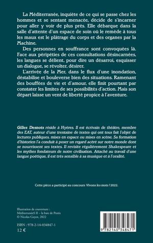 La Méditerranée, inquiète de ce qui se passe chez les hommes et se sentant menacée, décide de s'incarner pour aller y voir de plus près. Elle débarque dans la salle d'attente d'un espace de soin où le remède à tous les maux est le plâtrage du corps et des organes par la Machine. Des personnes en souffrance sont convoquées là. Face aux péripéties de ces consultations désincarnées, les langues se délient, pour dire un désarroi, esquisser un dialogue, se révolter, désirer. L'arrivée de la Mer, dans le flux d'une inondation, déstabilise et bouleverse bien des situations. Ramenant des bouffées de vie et d'amour, elle finit pourtant par constater les limites de ses possibilités d'action. Mais son départ laisse un vent de liberté propice à l'aventure.