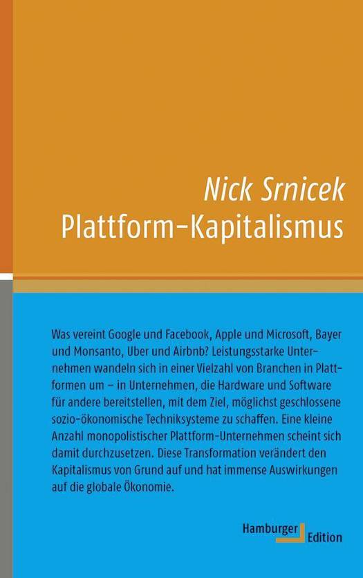 Was vereint Google, Facebook, Apple, Microsoft, Monsanto, Uber und Airbnb? Sie alle sind Unternehmen, die Hardware und Software für andere bereitstellen, mit dem Ziel, möglichst geschlossene sozio-ökonomische Tech-Systeme zu schaffen. Google kontrolliert die Recherche, Facebook regiert Social Media und Amazon ist führend beim E-Commerce. Doch nicht nur Technologie-Unternehmen bauen Plattformen auf, auch Traditionsfirmen wie Siemens entwickeln ein cloudbasiertes Produktionssystem.Plattformen sind in der Lage, immense Daten zu gewinnen, zu nutzen und zu verkaufen - Monopolisierungstendenzen sind die »natürliche« Folge. Sind wir auf dem Weg in einen digitalen Monopolkapitalismus? Diese Streitschrift ist unerlässlich für alle, die verstehen wollen, wie die mächtigsten technologischen Unternehmen unserer Zeit die globale Ökonomie verändern.