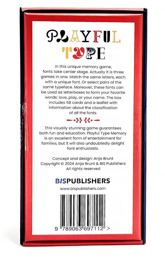 In this unique memory game, fonts take centre stage. Actually it is three games in one. Match the same letters, each with a unique font. Or select pairs of the same typeface. Moreover, these fonts can be used as letterboxes to form your favorite words: love, play, or your name. The box includes a leaflet with information about all the special fonts.