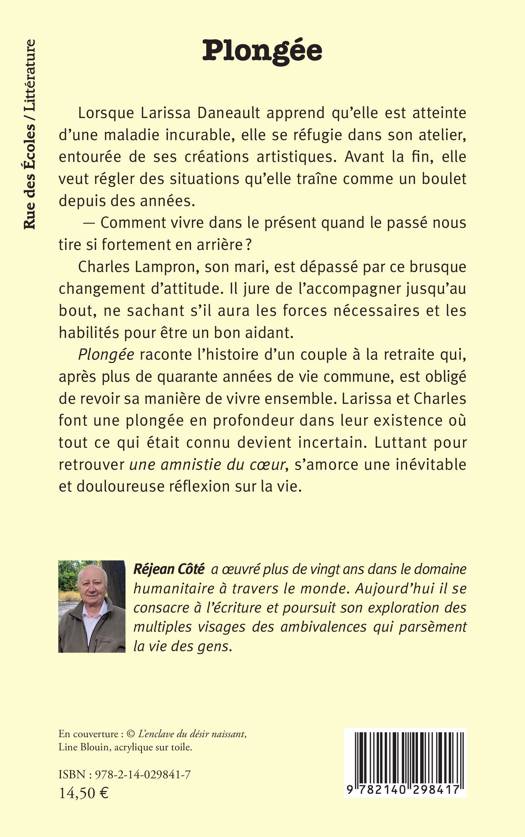 Lorsque Larissa Daneault apprend qu'elle est atteinte d'une maladie incurable, elle se réfugie dans son atelier, entourée de ses créations artistiques. Avant la fin, elle veut régler des situations qu'elle traîne comme un boulet depuis des années. - Comment vivre dans le présent quand le passé nous tire si fortement en arrière ? Charles Lampron, son mari, est dépassé par ce brusque changement d'attitude. Il jure de l'accompagner jusqu'au bout, ne sachant s'il aura les forces nécessaires et les habilités pour être un bon aidant. Plongée raconte l'histoire d'un couple à la retraite qui, après plus de quarante années de vie commune, est obligé de revoir sa manière de vivre ensemble. Larissa et Charles font une plongée en profondeur dans leur existence où tout ce qui était connu devient incertain. Luttant pour retrouver une amnistie du coeur, s'amorce une inévitable et douloureuse réflexion sur la vie.