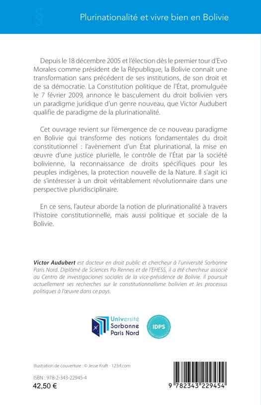 Depuis le 18 décembre 2005 et l'élection dès le premier tour d'Evo Morales comme président de la République, la Bolivie connaît une transformation sans précédent de ses institutions, de son droit et de sa démocratie. La Constitution politique de l'État, promulguée le 7 février 2009, annonce le basculement du droit bolivien vers un paradigme juridique d'un genre nouveau, que Victor Audubert qualifie de paradigme de la plurinationalité. Cet ouvrage revient sur l'émergence de ce nouveau paradigme en Bolivie qui transforme des notions fondamentales du droit constitutionnel: l'avènement d'un État plurinational, la mise en oeuvre d'une justice plurielle, le contrôle de l'État par la société bolivienne, la reconnaissance de droits spécifiques pour les peuples indigènes, la protection nouvelle de la Nature. Il s'agit ici de s'intéresser à un droit véritablement révolutionnaire dans une perspective pluridisciplinaire. En ce sens, l'auteur aborde la notion de plurinationalité à travers l'histoire constitutionnelle, mais aussi politique et sociale de la Bolivie.