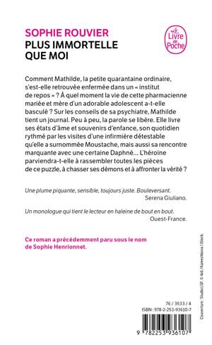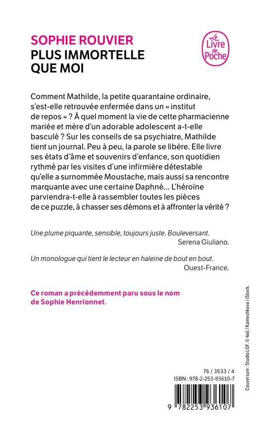 Comment Mathilde, la petite quarantaine ordinaire, s’est-elle retrouvée enfermée dans un « institut de repos » ? À quel moment la vie de cette pharmacienne mariée et mère d’un adorable adolescent a-t-elle basculé ? Sur les conseils de sa psychiatre, Mathilde tient un journal. Peu à peu, la parole se libère. Elle livre ses états d’âme et souvenirs d’enfance, son quotidien rythmé par les visites d’une infirmière détestable qu’elle a surnommée Moustache, mais aussi sa rencontre marquante avec une certaine Daphné… L’héroïne parviendra-t-elle à rassembler toutes les pièces de ce puzzle, à chasser ses démons et à affronter la vérité ?