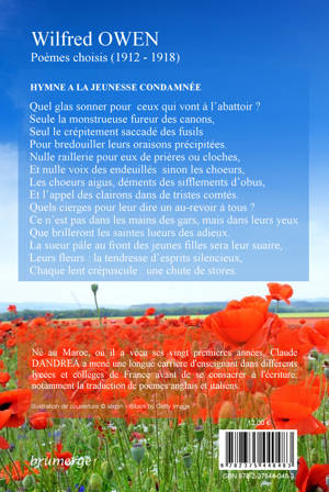 Tué sur le front en novembre 1918, une semaine avant l’armistice, Wilfred Owen est un des grands poètes anglais témoins des atrocités de la grande Guerre dont il dénonce à juste titre la barbarie et l’inutilité. Si son œuvre est réduite, étant donné les circonstances, elle compense cette brièveté par sa puissance évocatrice dans laquelle poésie encore romantique et réalisme plus moderne se côtoient. Ces deux aspects de son œuvre allient le lyrisme hérité de Keats que W. Owen vénérait (autre poète fauché par la maladie au même âge) et une évocation réaliste des combats admirablement rendue par un jeu de sonorités et de fausses rimes qui contribuent fortement à son ancrage dans la modernité.