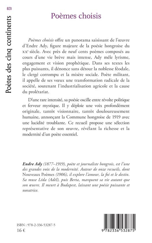 Poèmes choisis offre un panorama saisissant de l'oeuvre d'Endre Ady, figure majeure de la poésie hongroise du XXe siècle. Avec près de neuf cents poèmes composés au cours d'une vie brève mais intense, Ady mêle lyrisme, engagement et vision prophétique. Dans ses textes les plus puissants, il dénonce sans détour la noblesse féodale, le clergé corrompu et la misère sociale. Poète militant, il appelle de ses voeux une transformation radicale de la société, soutenant l'industrialisation agricole et la cause du prolétariat. D'une rare intensité, sa poésie oscille entre révolte politique et ferveur mystique. Il y déploie une voix profondément originale, tantôt visionnaire, tantôt douloureusement humaine, annonçant la Commune hongroise de 1919 avec une lucidité troublante. Ce recueil propose une sélection représentative de son oeuvre, révélant la richesse et la modernité d'un poète essentiel.