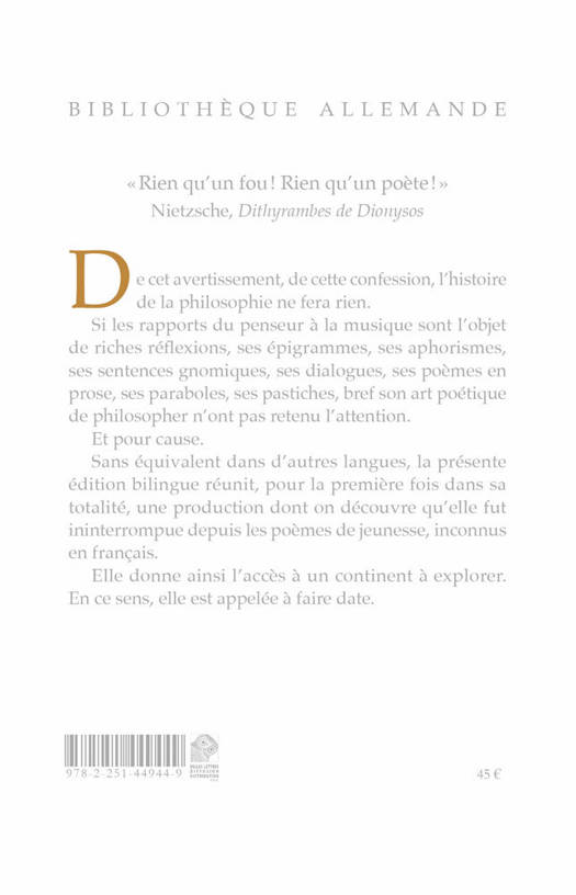 Voir aussi l'ouvrage de Marc Jimenez : « Rien qu'un fou, rien qu'un poète ». Une lecture des derniers poèmes de Nietzsche (1879- 1888).