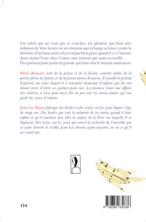 Un soleil qui ne veut pas se coucher, un glouton qui boit une infusion de Voie lactée ou un mouton qui échange sa laine contre la fourrure d'un lama, tout cela n'est pas bien grave quand il y a l'amour, deux mains l'une dans l'autre, une maison qui nous accueille. Des poèmes pour petits et grands, qui font voir le monde autrement.