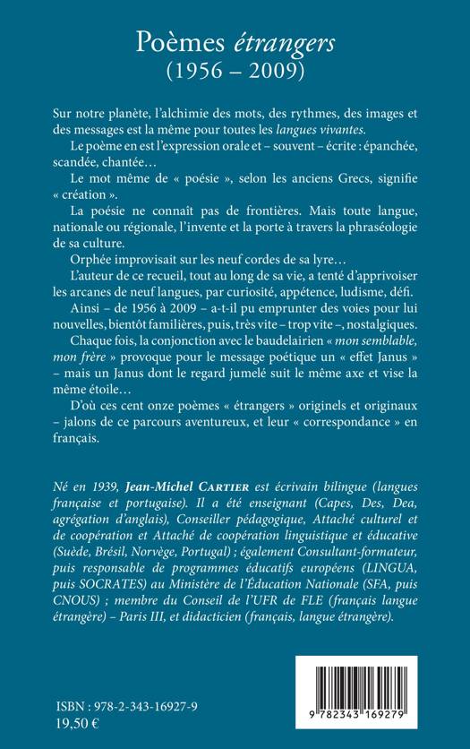 Sur notre planète, l'alchimie des mots, des rythmes, des images et des messages est la même pour toutes les langues vivantes. Le poème en est l'expression orale et souvent écrite : épanchée, scandée, chantée Le mot même de « poésie », selon les anciens Grecs, signifie« création ». La poésie ne connaît pas de frontières. Mais toute langue, nationale ou régionale, l'invente et la porte à travers la phraséologie de sa culture. L'auteur de ce recueil, tout au long de sa vie, a tenté d'apprivoiser les arcanes de neuf langues, par curiosité, appétence, ludisme, défi. Ainsi de 1956 à 2009 a-t-il pu emprunter des voies pour lui nouvelles, bientôt familières, puis, très vite trop vite , nostalgiques.