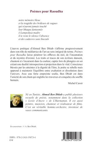 L'oeuvre poétique d'Ahmed Ben Dhiab s'affirme progressivement dans son rôle de médiatrice au sens intégral du terme. Poèmes pour Raoudha laisse pénétrer les effluves du réel, de l'incantation et du mystère d'exister. Conscience blessée par les atteintes à la dignité de l'être, le poète se rebelle mais apprend à maintenir l'équilibre entre exaltation et dissolution de l'univers.