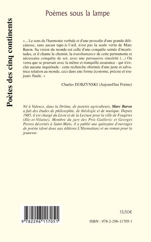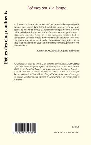 "... Le sens de l'harmonie verbale et d'une prosodie d'une grande délicatesse, sans aucun tape-à-l'oeil, n'est pas la seule vertu de Marc Baron. Sa vision du monde est celle d'une conquête semée d'incertitudes, et il chante le chemin, la transhumance de cette permanente et nécessaire conquête de soi, avec une persuasive sincérité (...) Charles Dobzynski (Aujourd'hui poème)