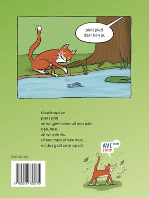 daar loopt ze. poes piet. ze wil geen voer uit een pak. nee, nee. ze wil een vis. of een muis of een mus … en dus gaat ze er op uit.