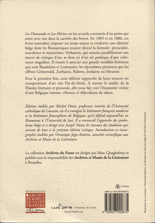 Les Flamandes et Les Moines ou les recueils contrastés d'un poète qui entre avec eux dans la carrière des lettres. En 1883 et en 1886, ces livres entendent imposer un jeune auteur et conforter une identité belge dont les Romantiques avaient donné la formule : picturalité, truculence et mysticisme. Verhaeren, qui entame parallèlement son œuvre de critique d'art, se dote ici d'un art poétique d'une cohérence singulière. Il réussit à associer aux grands modèles littéraires que sont Baudelaire et Lemonnier, les répondants picturaux que lui offrent Grünewald, Zurbaran, Rubens, Jordaens ou Meunier. Pour la première fois, cette édition rapproche de leurs sources ces transpositions d'art très Fin-de-Siècle. A travers le mythe de la Flandre littéraire et picturale, elle nous fait voir l'étonnante vitrine d'une Belgique intense, vibrante et débordante de talent.