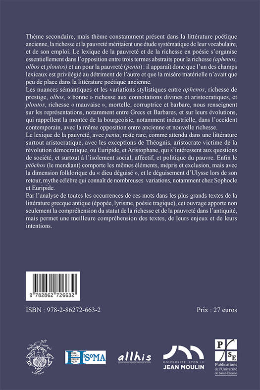 Dans un corpus constitué de poésie grecque épique, lyrique, tragique et comique, les auteurs de cette étude analysent les occurrences relatives à la richesse et à la pauvreté.