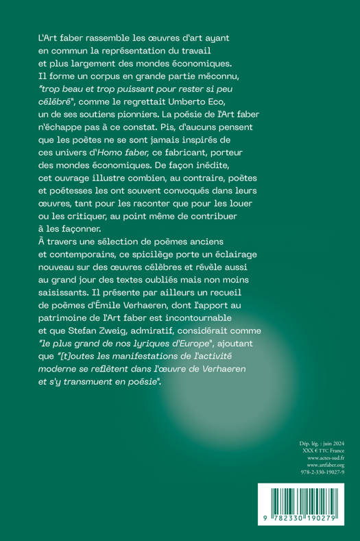 Poésie de l'Art faber permet de porter un regard nouveau, au prisme de l'Art faber, sur les créations anciennes et contemporaines de poètes célèbres. Il offre aussi l'occasion d'introduire des oeuvres moins connues, voire oubliées, dont l'apport à l'Art faber comme à l'histoire de la poésie n'en est pas moins important.