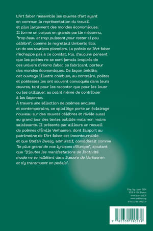 L'Art faber réunit les oeuvres ayant pour thèmes le travail, l'entreprise et, plus largement, les mondes économiques. Il forme un corpus en grande partie méconnu, "trop beau et trop puissant pour rester si peu célébré", regrettait Umberto Eco, soutien pionnier de la promotion de l'Art faber. La poésie de l'Art faber n'échappe pas à ce constat. Pis, d'aucuns pensent que les poètes ne se sont jamais inspirés de ces univers économiques d'Homo faber.