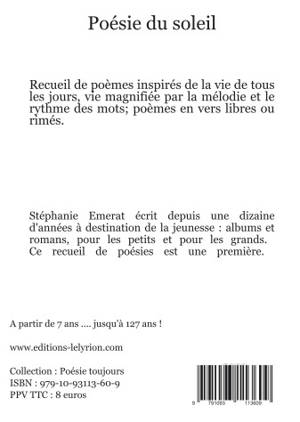 « Poésie du soleil » s’adresse à tous et provient d’une observation qui se veut légère du quotidien. Les poèmes sont inspirés de la vie de tous les jours, vie magnifiée par la mélodie et le rythme des mots ; poèmes en vers libres ou rimés. Quelques titres : . Le nouveau-né . Le chat . Cette chanson . La groseille . La chaise . Tristesse . Le sourire . L’orage . Soleil