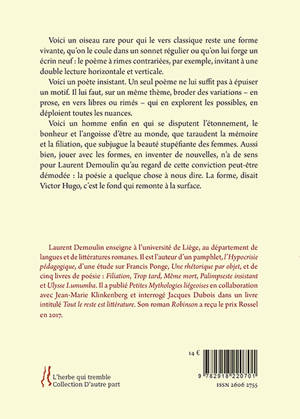 Voici un oiseau rare pour qui le vers classique reste une forme vivante, qu’on le coule dans un sonnet régulier ou qu’on lui forge un écrin neuf : le poème à rimes contrariées, par exemple, invitant à une double lecture horizontale et verticale. Voici un poète insistant. Un seul poème ne lui suffit pas à épuiser un motif. Il lui faut, sur un même thème, broder des variations – en prose, en vers libres ou rimés – qui en explorent les possibles, en déploient toutes les nuances. Voici un homme enfin en qui se disputent l’étonnement, le bonheur et l’angoisse d’être au monde, que taraudent la mémoire et la filiation, que subjugue la beauté stupéfiante des femmes. Aussi bien, jouer avec les formes, en inventer de nouvelles, n’a de sens pour Laurent Demoulin qu’au regard de cette conviction peut-être démodée : la poésie a quelque chose à nous dire. La forme, disait Victor Hugo, c’est le fond qui remonte à la surface.