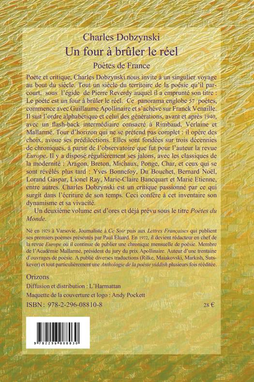 Poète et critique, Charles Dobzynski nous invite à un singulier voyage au bout du siècle. Tout un siècle du territoire de la poésie qu'il parcourt, sous l'égide de Pierre Reverdy auquel il a emprunté son titre : « Le poète est un four à brûler le réel ». Ce panorama englobe 57 poètes, commence avec Guillaume Apollinaire et s'achève sur Franck Venaille. Il suit l'ordre alphabétique et celui des générations, avant et après 1940, avec un flash-back intermédiaire consacré à Rimbaud, Verlaine et Mallarmé. Tour d'horizon qui ne se prétend pas complet : il opère des choix, avoue ses prédilections. Elles sont fondées sur trois décennies de chroniques, à partir de l'observatoire que fut pour l'auteur la revue Europe. Il y a disposé régulièrement ses jalons, avec les classiques de la modernité.