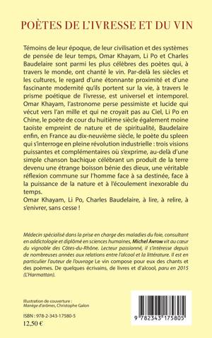 Témoins de leur époque, de leur civilisation et des systèmes de pensée de leur temps, Omar Khayam, Li Po et Charles Baudelaire sont parmi les plus célèbres des poètes qui, à travers le monde, ont chanté le vin. Par-delà les siècles et les cultures, le regard d'une étonnante proximité et d'une fascinante modernité qu'ils portent sur la vie est universel et intemporel. Omar Khayam, l'astronome perse pessimiste et lucide qui vécut vers l'an mille et qui ne croyait pas au Ciel, Li Po en Chine, le poète de cour du huitième siècle également moine taoïste empreint de nature et de spiritualité, Baudelaire enfin, en France au dix-neuvième siècle, le poète du spleen qui s'interroge en pleine révolution industrielle : trois visions puissantes et complémentaires où s'exprime une véritable réflexion commune sur l'homme face à sa destinée, face à la puissance de la nature et à l'écoulement inexorable du temps.