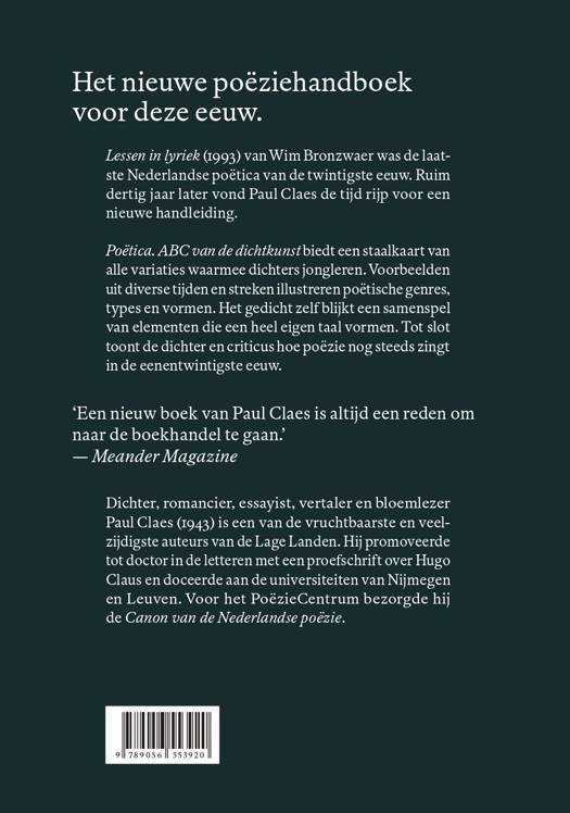 Lessen in lyriek (1993) van Wim Bronzwaer was de laatste Nederlandse poëtica van de twintigste eeuw. Ruim dertig jaar later vond Paul Claes de tijd rijp voor een nieuwe handleiding. Poëtica. ABC van de dichtkunst biedt een staalkaart van alle variaties waarmee dichters jongleren. Voorbeelden uit diverse tijden en streken illustreren poëtische genres, types en vormen. Het gedicht zelf blijkt een samenspel van elementen die een heel eigen taal vormen. Tot slot toont de dichter en criticus hoe poëzie nog steeds zingt in de eenentwintigste eeuw.