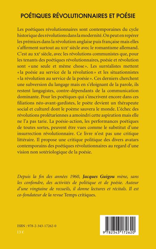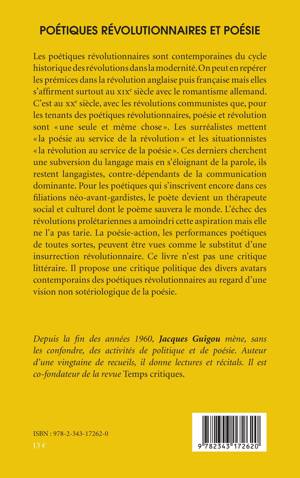 Les poétiques révolutionnaires sont contemporaines du cycle historique des révolutions dans la modernité. On peut en repérer les prémices dans la révolution anglaise puis française mais elles s'affirment surtout au xixe siècle avec le romantisme allemand pour s'épanouir au xxe siècle, avec les révolutions communistes. Ce livre propose une critique politique des divers avatars contemporains des poétiques révolutionnaires, au regard d'une vision non sotériologique de la poésie.